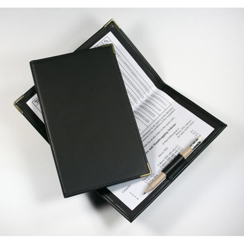 Our Malvern golf score card holder is supplied complete with pencil and handicap calculator. The item is stocked in Black but can be supplied in corporate colours