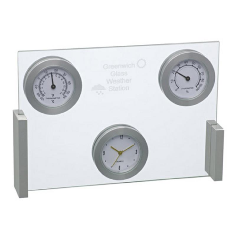 Includes Aluminium Metal & Glass Stand Housing Clock, Thermometer & Hygrometer. Supplied in Deluxe Gift Box.