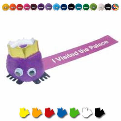 Logobug wearing a card crown Ribbon attached with your promotional message printed in full colour Full range of 44 pom colours
